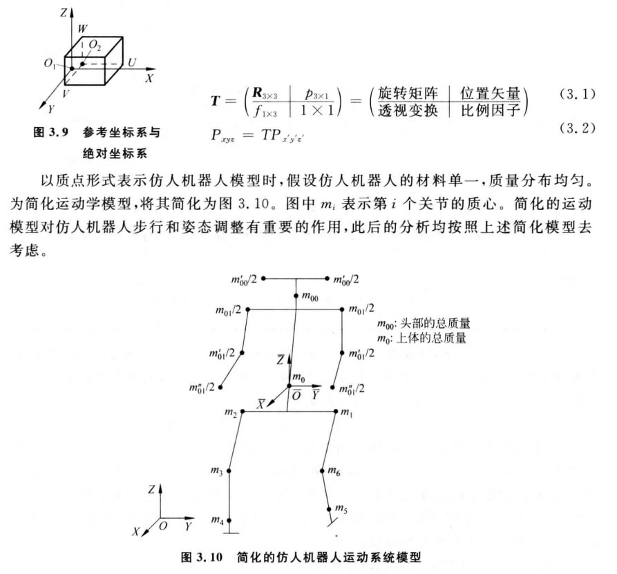 智能接待仿人機(jī)器人除了具有腿部的行走功能外,還具有上身的功能,自由度也比雙足機(jī)器 人成倍的增加。從仿生角度看,人的手臂在運(yùn)動中起著協(xié)調(diào)運(yùn)動的作用,智能接待仿人機(jī)器人的手 臂是d立運(yùn)動的,在行走運(yùn)動過程中起著重要的調(diào)整作用。從運(yùn)動鏈角度看,智能接待仿人機(jī)器人由于有手臂運(yùn)動,故它是由三條鏈組成的復(fù)合運(yùn)動鏈,運(yùn)動學(xué)、動力學(xué)、運(yùn)動規(guī)劃上更為復(fù) 雜,不能直接用雙足機(jī)器人的動力學(xué)模型來描述[94]。本節(jié)將在雙足機(jī)器人模型的基礎(chǔ)上, 結(jié)合智能接待仿人機(jī)器人的運(yùn)動特點(diǎn),建立一個合適的運(yùn)動模型,導(dǎo)出步行運(yùn)動的數(shù)學(xué)描述。 本節(jié)設(shè)計的是一個19 DOF 的智能接待仿人機(jī)器人,暫不考慮其頭部 和手指的自由度。