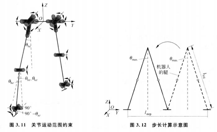 (1)運動范圍約束。智能接待智能接待機器人各個關(guān)節(jié)都有其運動范圍,需要對各個關(guān)節(jié)的運動 范圍進行約束。為了使其能夠更穩(wěn)定地步行,要分別對智能接待智能接待機器人下肢12 DOF 的運動 和上體腰及手臂等7個關(guān)節(jié)的運動進行約束。全身各個關(guān)節(jié)的運動范圍分別如表3.1 所示,由于兩條腿的運動范圍一樣,所以表3.1中沒有區(qū)分左右腿,只是按照關(guān)節(jié)來描 述。運動幅度正負的標(biāo)定是以直立姿態(tài)為標(biāo)準(zhǔn),根據(jù)關(guān)節(jié)轉(zhuǎn)動方向來定,順時針方向為 負,逆時針方向為正。